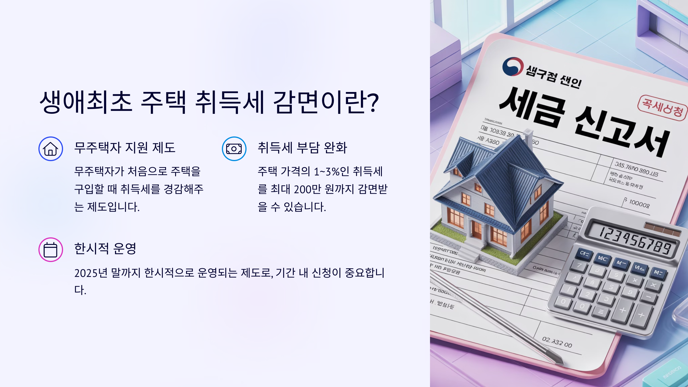 생애최초 주택 취득세 감면 제도는 실질적인 세금 부담 완화를 목표로 하고 있으며, 감면 한도는 최대 200만 원까지입니다. 해당 금액은 취득세, 지방교육세, 농어촌특별세를 포함한 총 세액 기준입니다.