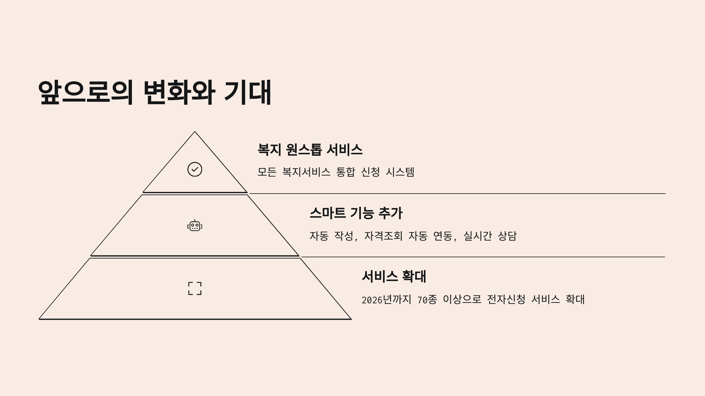 온라인 기반의 시스템이 안정화되면 신청서 자동 작성, 자격조회 자동 연동, 실시간 상담 기능 등이 추가될 것으로 보이며, 궁극적으로는 ‘복지 원스톱 서비스’가 현실화될 것으로 예상됩니다.