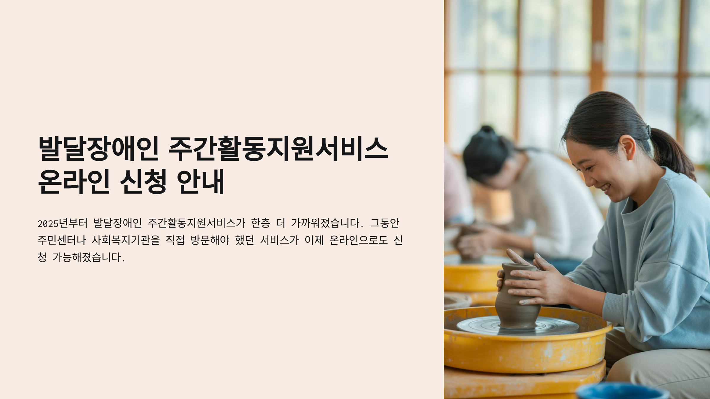 2025년부터 발달장애인을 위한 주간활동지원서비스가 한층 더 가까워졌습니다. 그동안에는 주민센터나 사회복지기관을 직접 방문해 신청해야 했던 주간활동지원서비스가 이제는 온라인으로도 신청 가능해졌습니다.