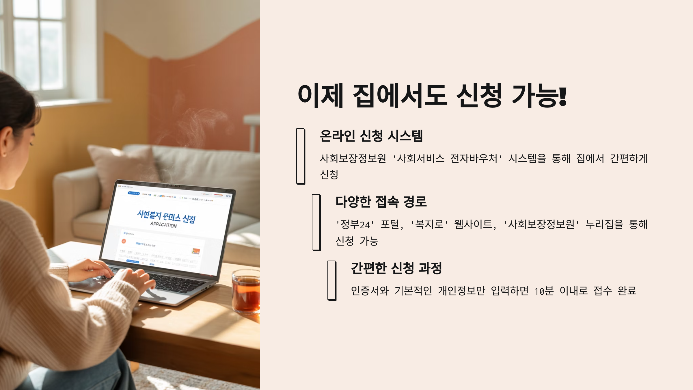 ‘정부24’ 포털이나 ‘복지로’ 웹사이트, 또는 ‘사회보장정보원’ 누리집을 통해 관련 서비스를 신청할 수 있으며, 인증서와 기본적인 개인정보만 입력하면 10분 이내로 접수가 완료됩니다.